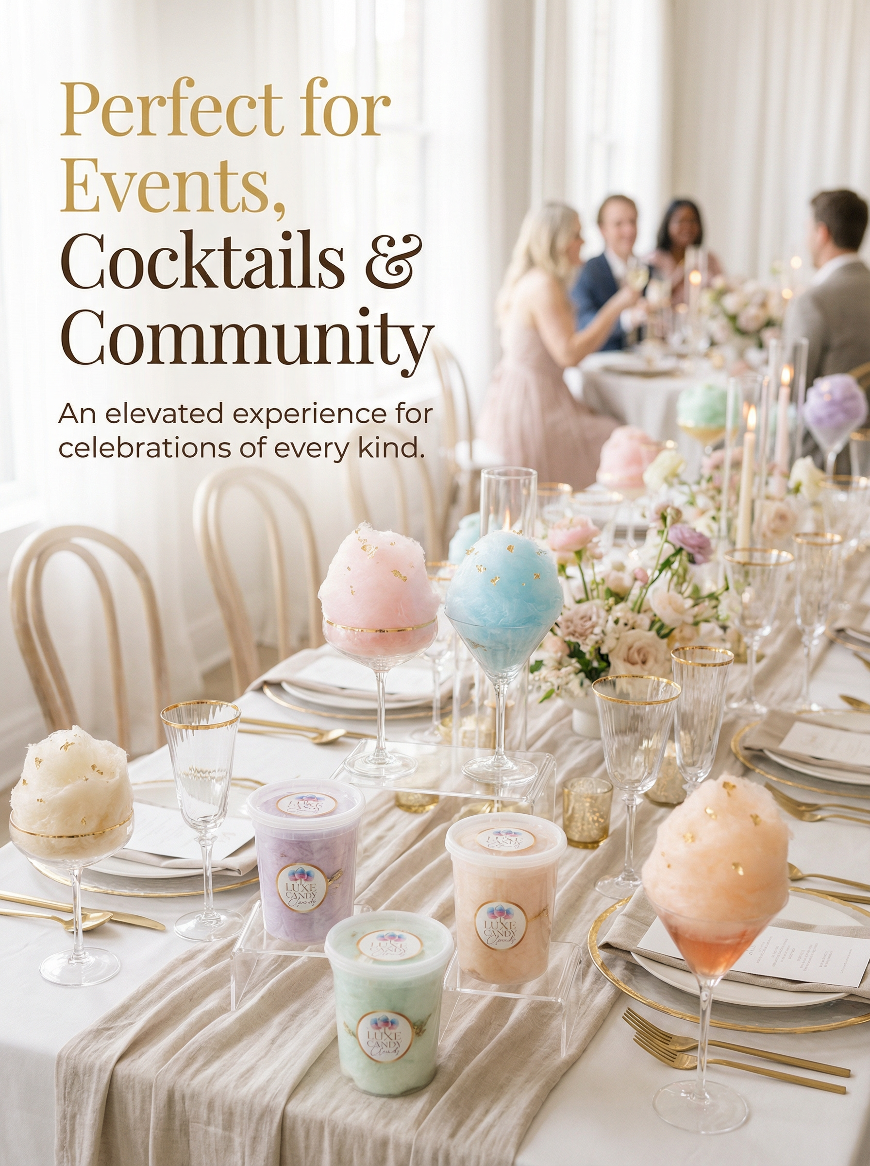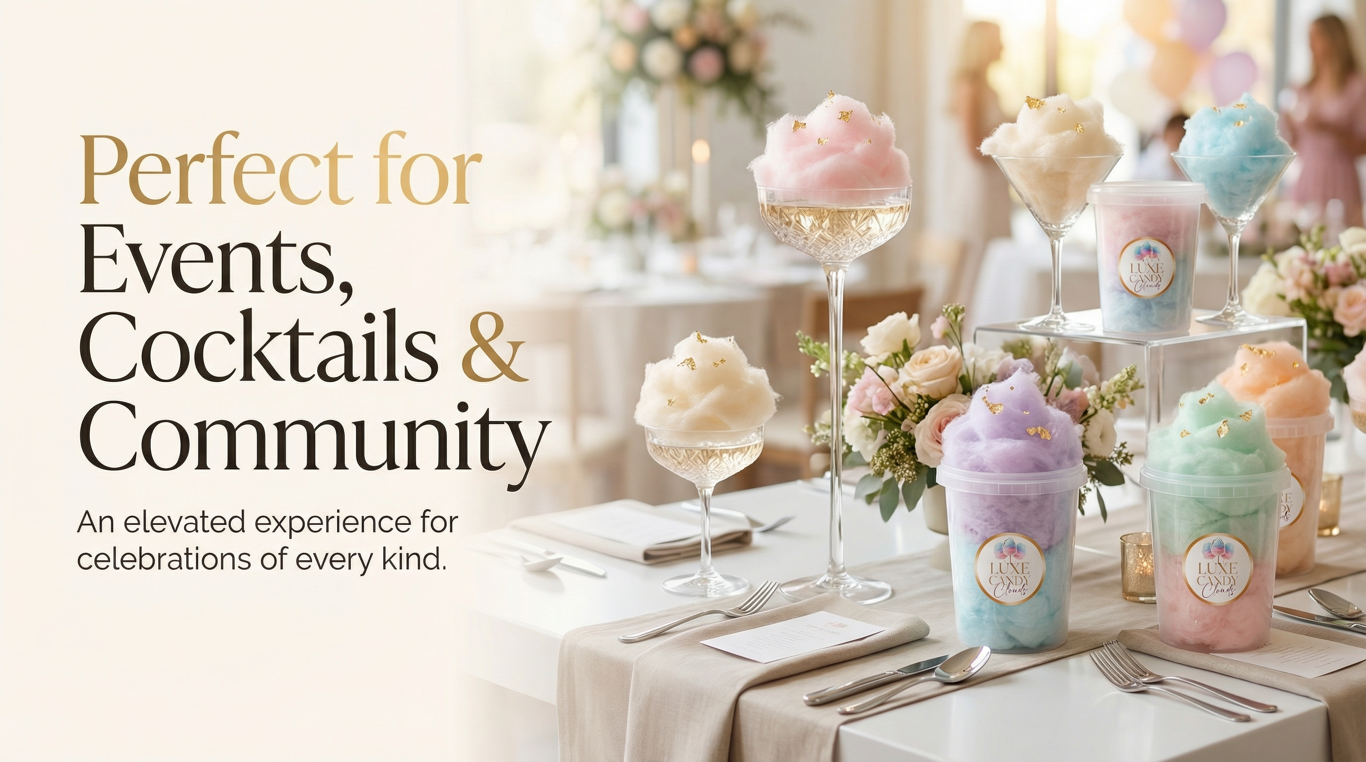 From weddings to baby showers, birthdays to brunches, corporate events to cocktail bars, Luxe Candy Clouds fits every celebration. A treat that’s beautiful, memorable, and made to impress.