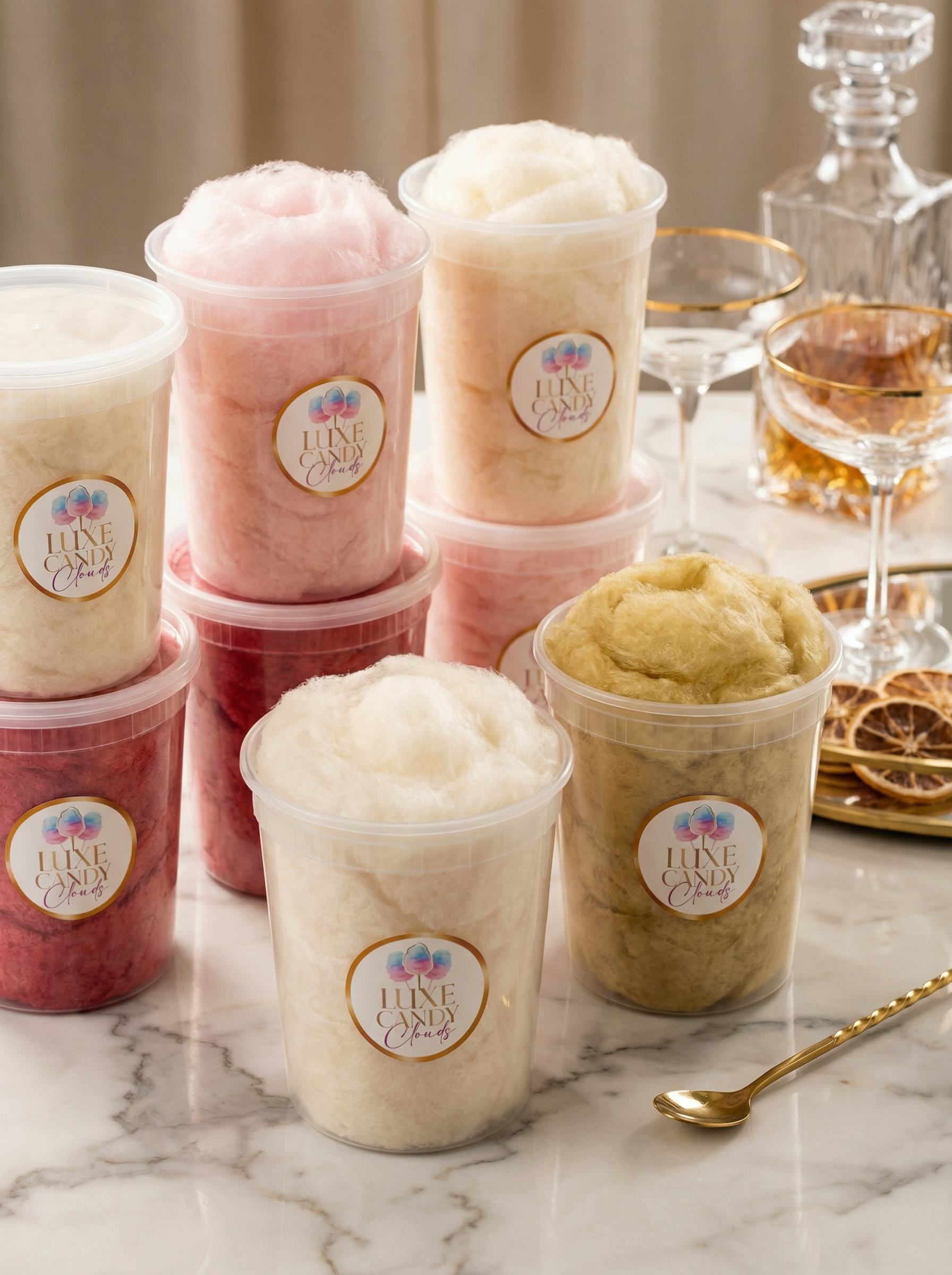 Custom Flavor Creations • 32oz Tubs to Take Home • Edible Glitter Mix-Ins • Wedding & Lounge Cotton Candy Bar • Cocktail Toppers • Luxury Live Spinning Experience