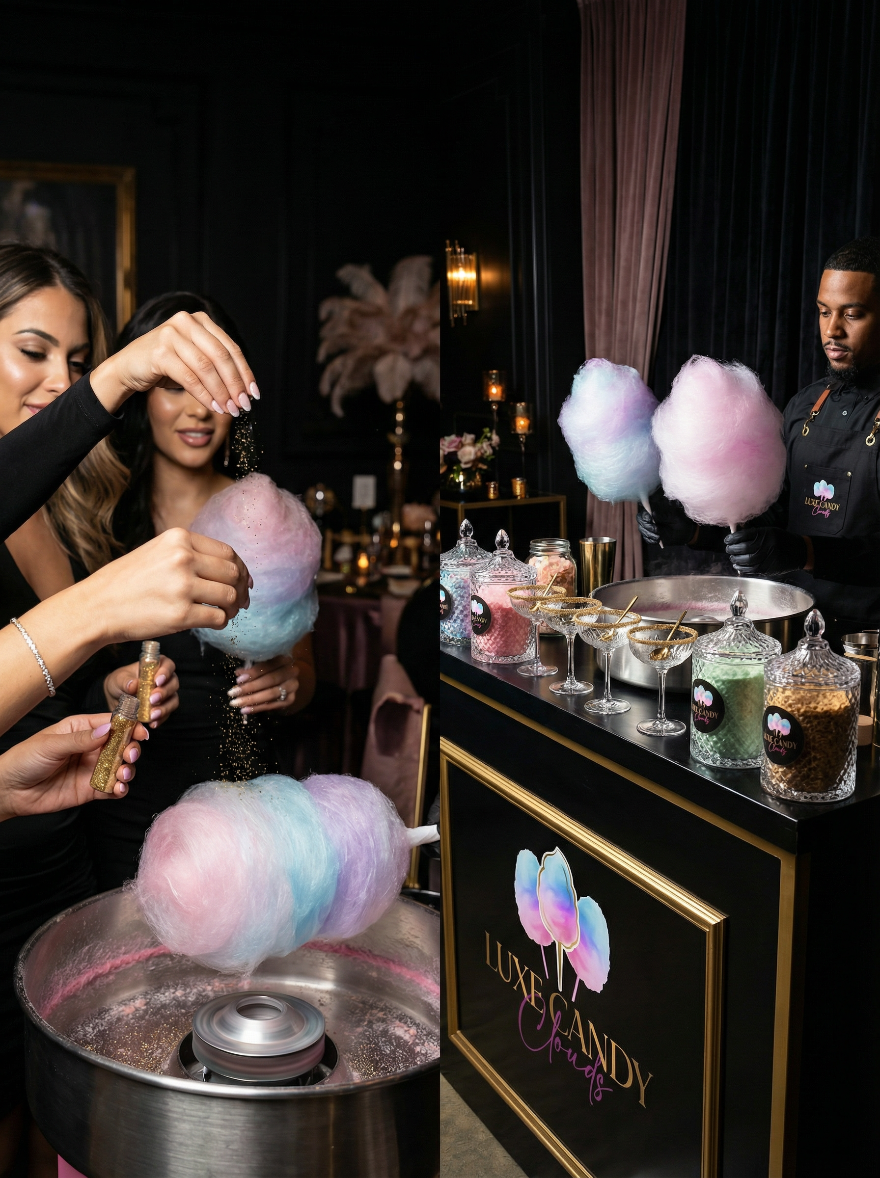 Elevate your special day with a luxe cotton candy experience. From cocktail-hour toppers to a full cotton candy bar, Luxe Candy Clouds adds a dreamy, interactive touch your guests will never forget. Perfect for weddings, corporate events, galas, and upscale celebrations.